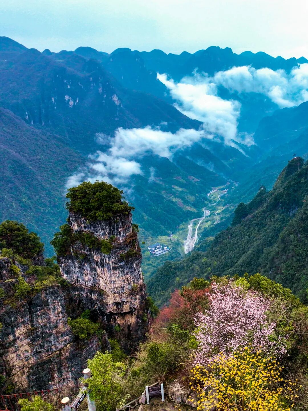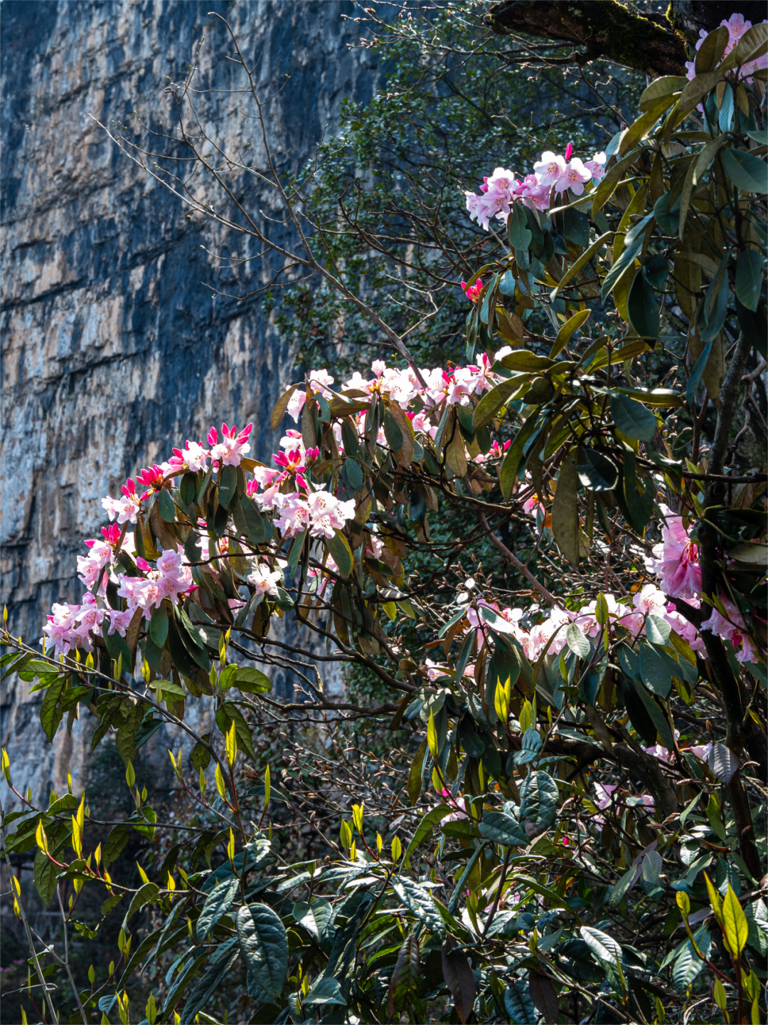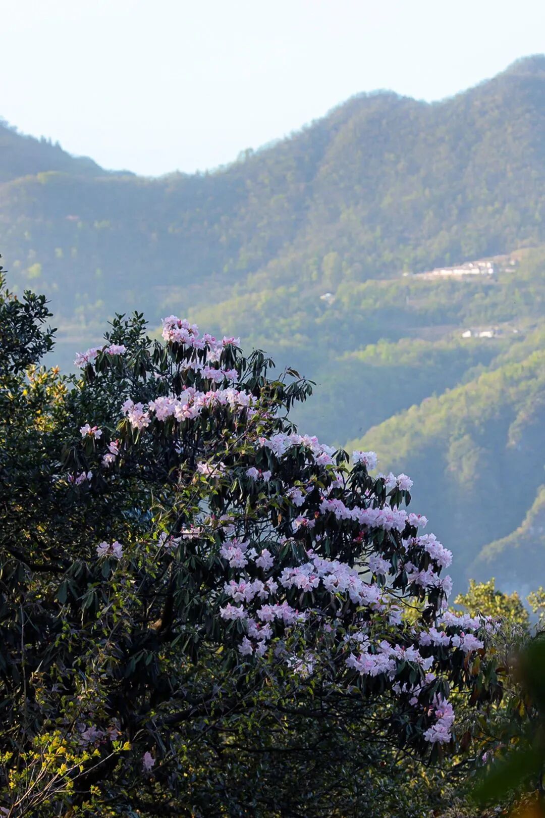 柴埠溪景区内高山云锦杜鹃进入盛放期。漫山遍野的粉色花朵夹杂在刚刚苏醒的群山之间,层层叠叠,温和优雅。峡谷溪流旁、山林间、岩石边......一步一景,随处可见惊喜。