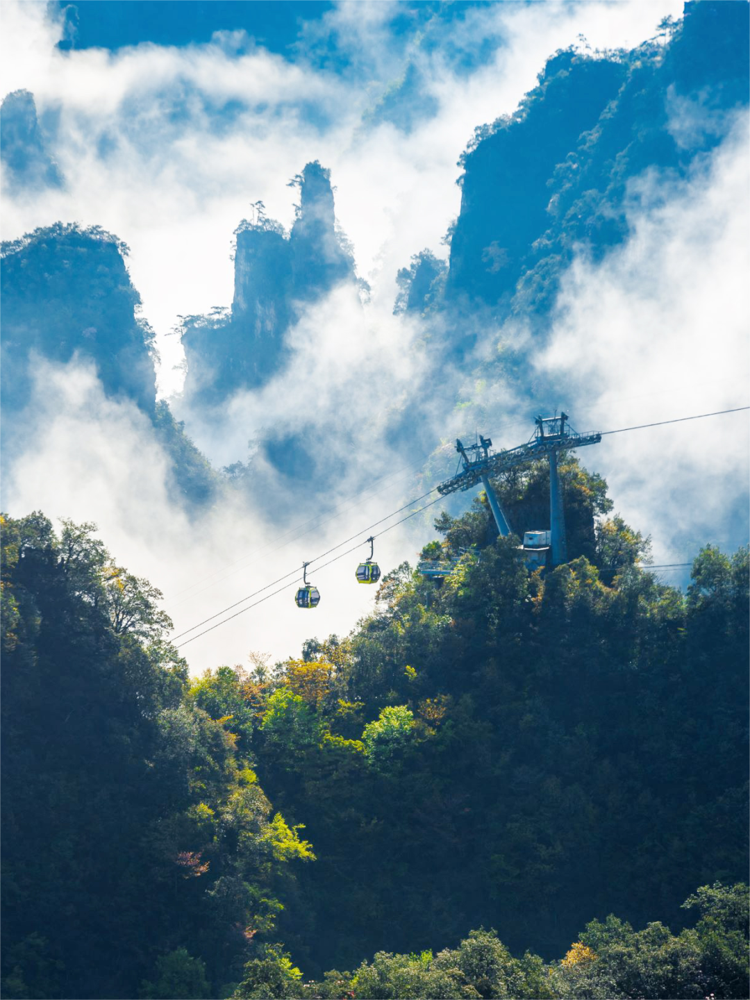 正因如此,山野间的色彩丰富起来,别有一番风味。这个时候乘坐索道上山,再合适不过了。索道全长1608米,上下高差793米,垂直角度44.9°,目前全中国最先进、最陡的索道。