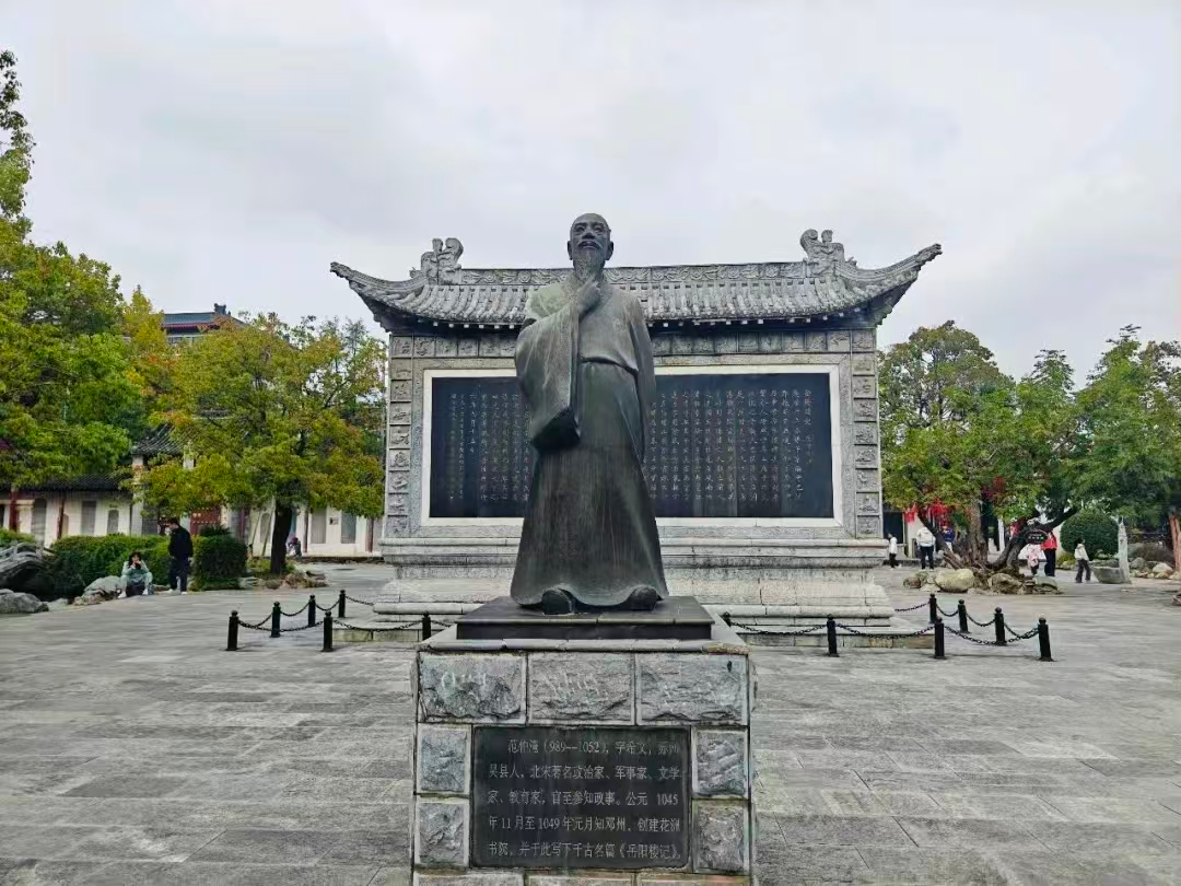书院前“景范坊”石牌坊巍然屹立,石柱上题写着楹联:“人育文化越千年国学光华昭日月,文化育人益万世先贤厚德贯古今。”此坊为范公三十七世孙范止安为纪念《岳阳楼记》问世九百六十周年而立,这不仅是家族对先贤的追思,更是穿越时空的文化对话。